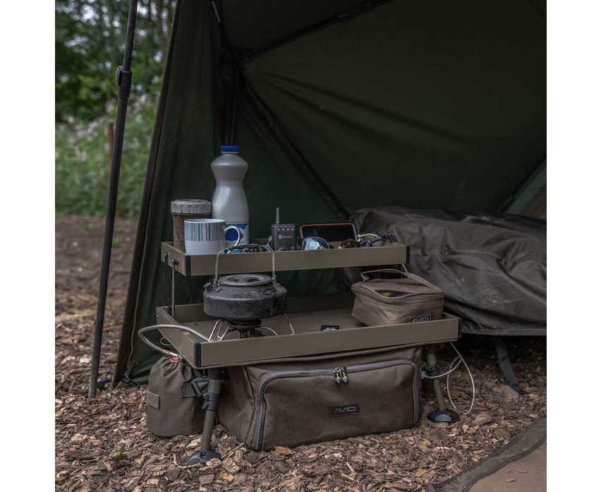 Double Decker Bivvy Organizer je vybaven dvěma patry pro dosažení maximálních skladovacích prostor pro vaše nepostradatelné vybavení.