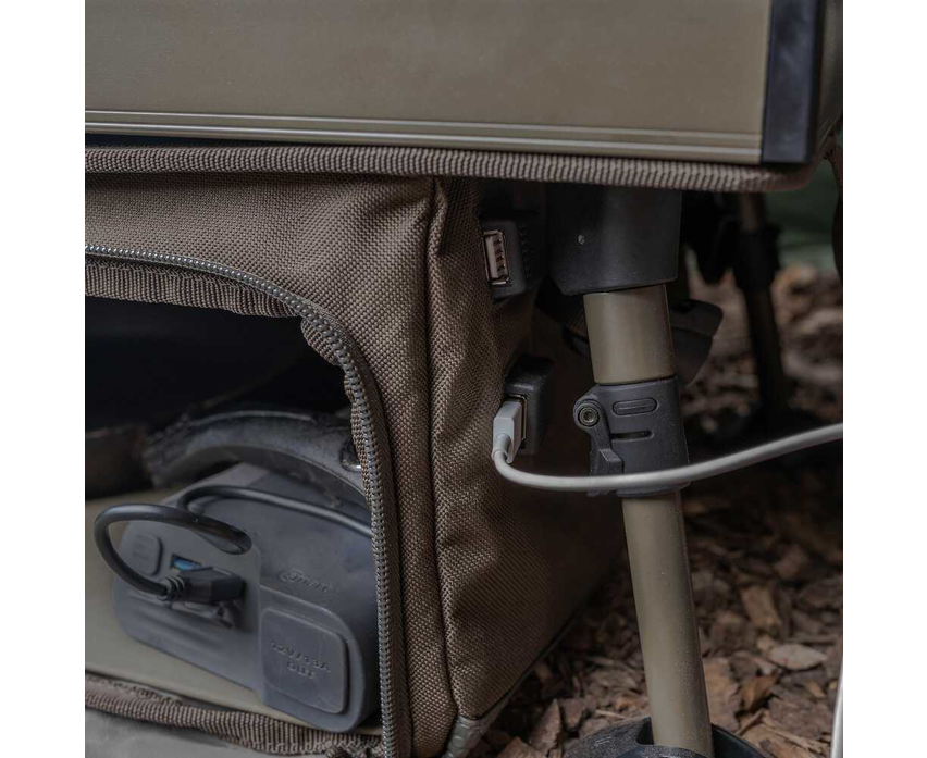 V dolním patře pojme organizér prostornější kousky vybavení. Pokud hledáte větší úložiště pro vaše vybavení, které chcete mít v bivaku při ruce, tak jste jej nyní našli. Dolní přihrádka organizéru obsahuje 2 USB porty, díky nim můžete mít cenné Powerbanky uloženy ve spodním šteláři a zárověň nabíjet svá zařízení na horní desce organizéru.