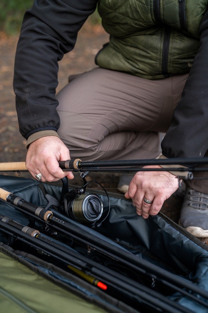 Přihrádka na pruty se odklápí od zadní strany a poskytuje všechny výhody toulce s dodatečnou ochranou prutů.