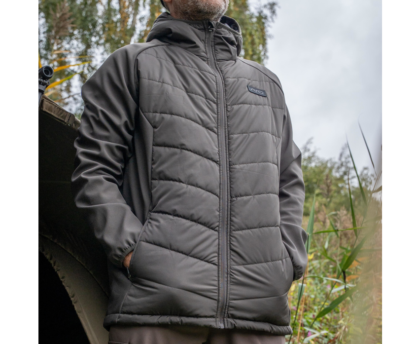 - Avid Carp Bunda Thermite Hybrid Jacket kombinuje teplo díky prošívané části typu puffa na těle s flexibilitou a prodyšností softshellu na rukávech a bocích– nabízí dokonalou rovnováhu mezi izolací a pohybem pro celoroční nošení.