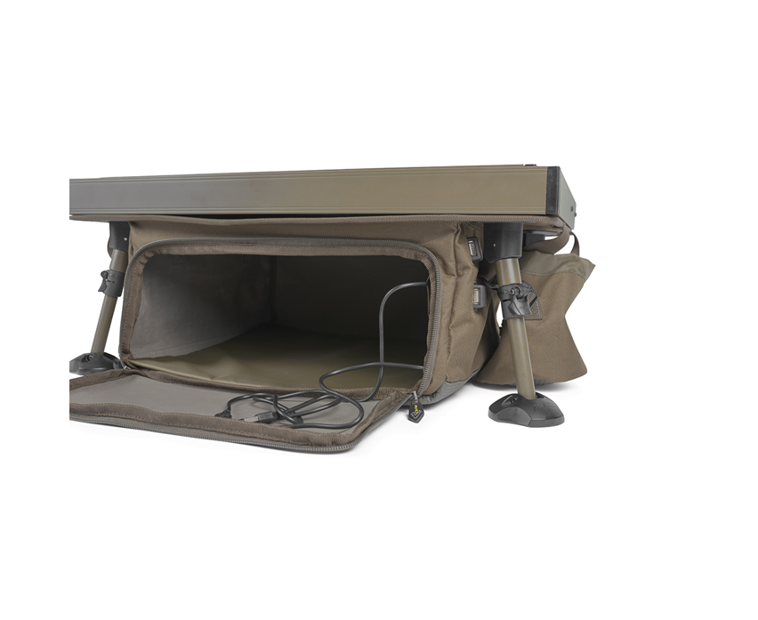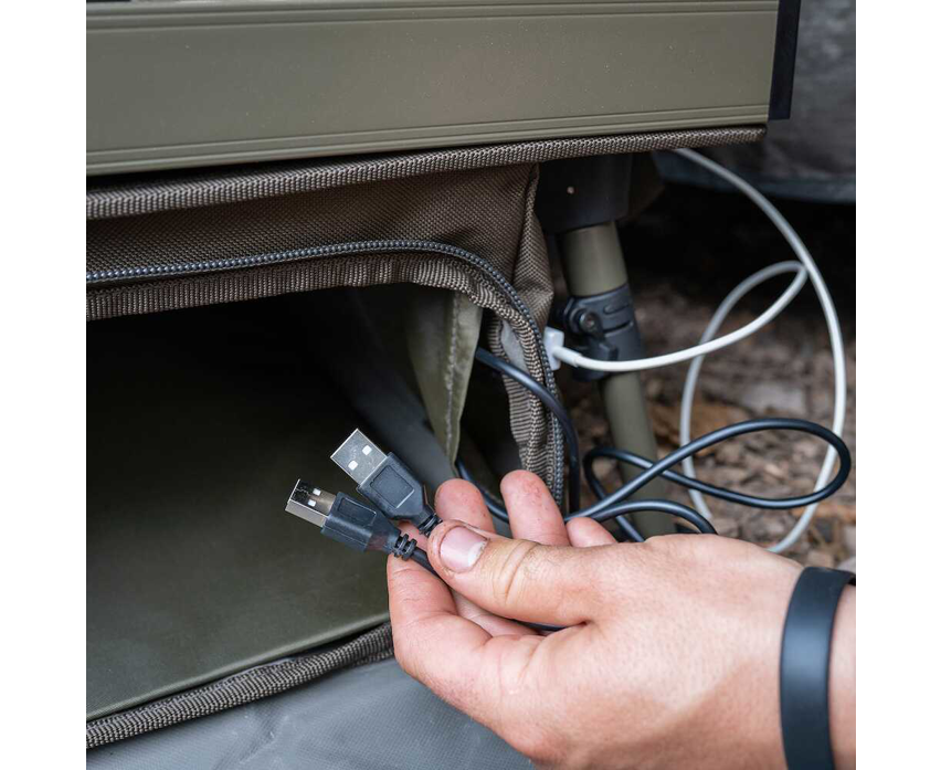V dolním patře pojme organizér prostornější kousky vybavení. Pokud hledáte větší úložiště pro vaše vybavení, které chcete mít v bivaku při ruce, tak jste jej nyní našli. Dolní přihrádka organizéru obsahuje 2 USB porty, díky nim můžete mít cenné Powerbanky uloženy ve spodním šteláři a zárověň nabíjet svá zařízení na horní desce organizéru.