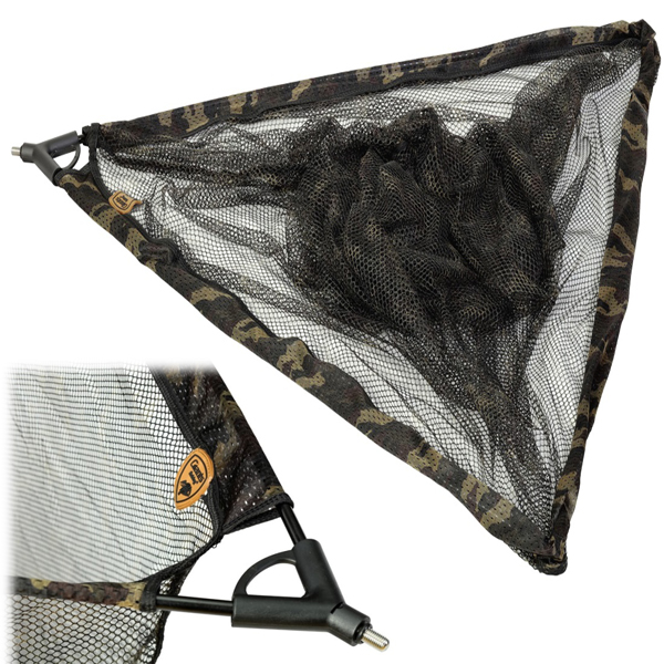 Vysoce kvalitní podběráková hlava určená pro lov kaprů, která je vyrobena z jemné kamuflážové síťoviny šetrné k rybám