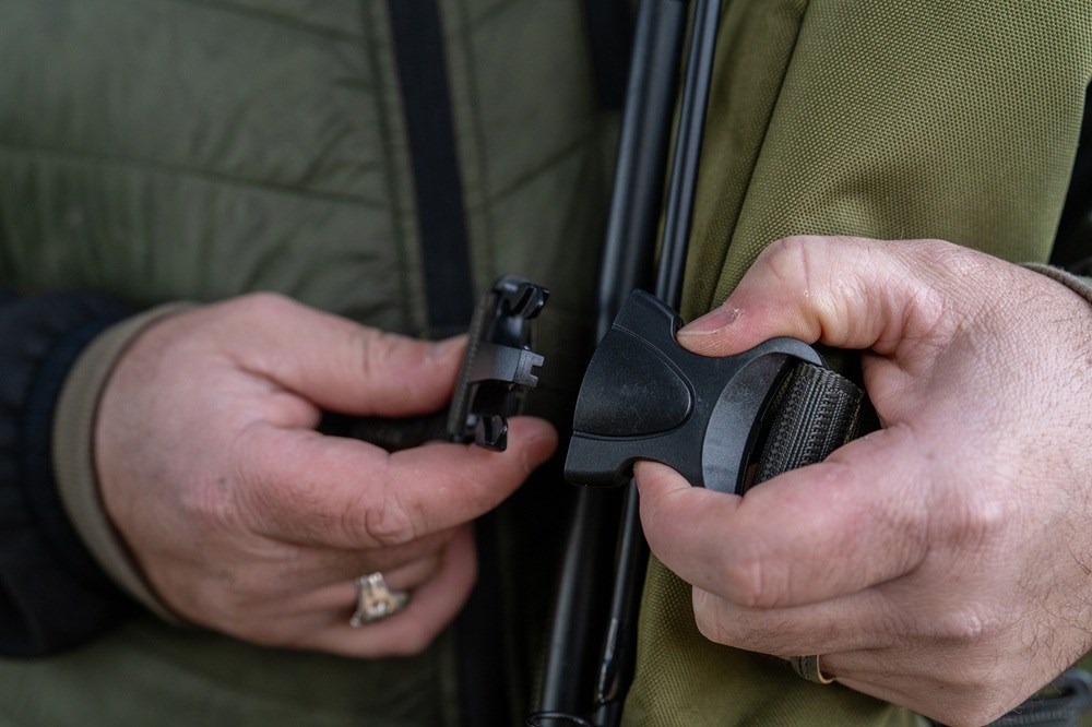 Přihrádka na pruty se odklápí od zadní strany a poskytuje všechny výhody toulce s dodatečnou ochranou prutů.